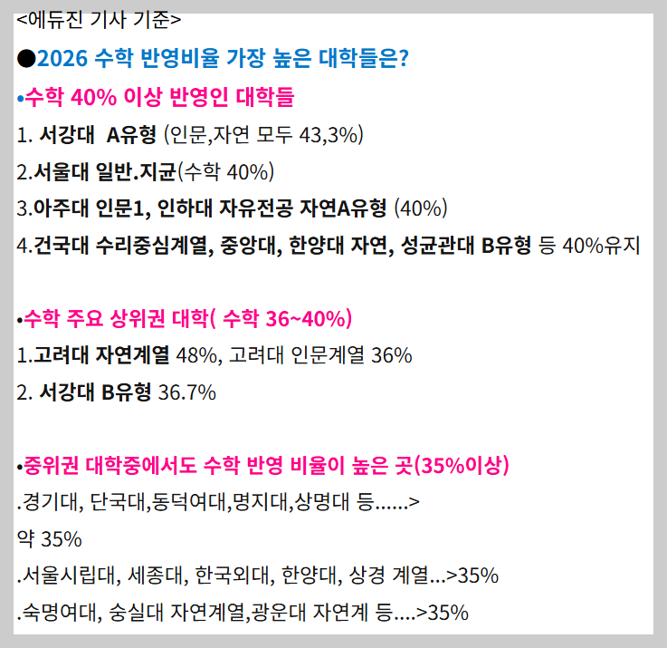 | 2026년 정시 수학 반영 높은 대학은 어디? (0) | 2025.09.30 |