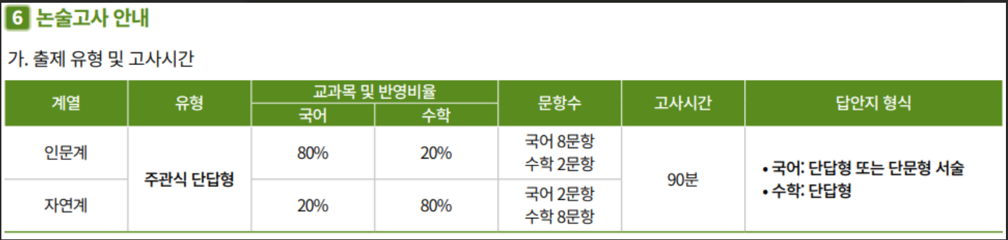 - 논술 100% 전형: 학생부 등 다른 전형 요소 없이 논술고사 성적만 100% 반영합니다. 논술 실력이 있다면 내신 성적이 다소 부족해도충분히 합격을 노려볼 수 있습니다.